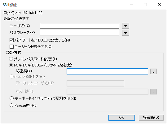 認証方式で「 RSA/DSA/ECDSA/ED25519鍵を使う 」にチェックをいれ、をクリックし、生成した秘密鍵のファイル( id_rsa ) 選択します。