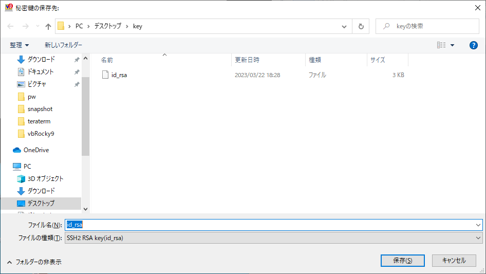 「 秘密鍵の保存(P) 」をクリックします。ファイル名はデフォルトで「 id_rsa 」と入力されているため、そのまま保存します。