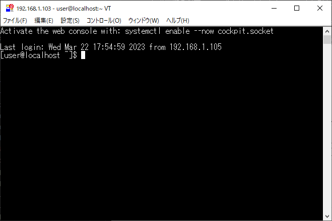「 Tera Term 新しい接続 」の画面で必要情報を入力後、「 OK 」をクリックすると以下の画面にかわります。