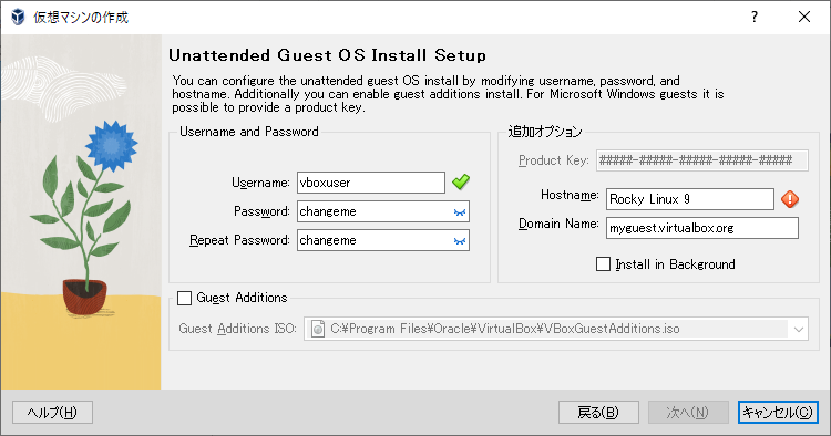 Hostname が長い場合、短く変更するように注意が表示されます。変更しないと「 次へ(N) 」がグレーアウトしたまま次の画面に進めません。