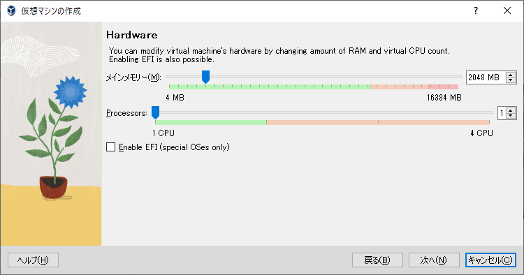 バーチャルマシンのメモリをどれくらいに設定するかを決めます。