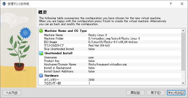 設定内容に問題がなければ、完了のボタンをクリックします。