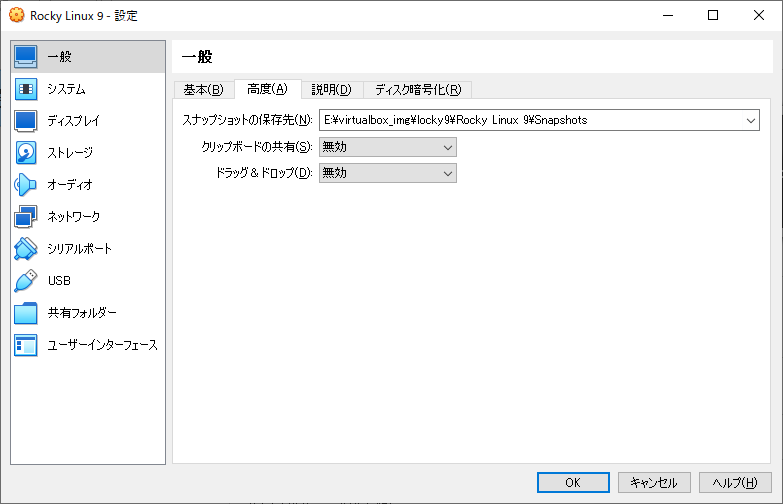 VirtualBox のスクリーンショットの保存先を変更する場合は、「 一般 - 高度(A)のタブ 」の中の「 スナップショットの保存先 」を任意のディレクトリに変更します。