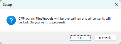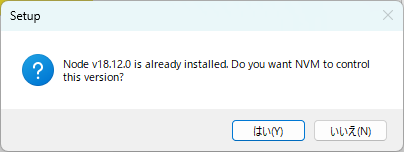 すでにnode.js がインストールされていた場合は、次のような画面が表示されるので「 はい 」をクリックします。