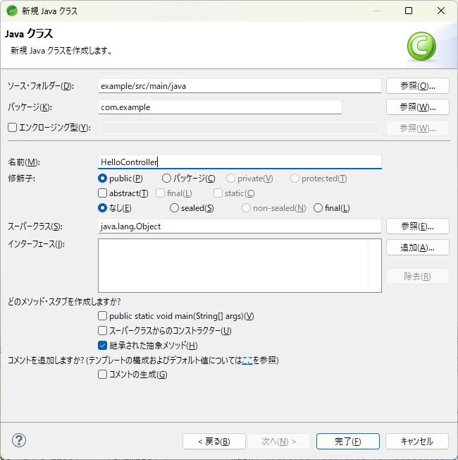 src/main/javaのcom.exampleというパッケージ内にHelloController.javaが作成されています。