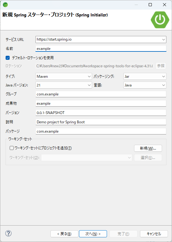 [2m2025-09-02T17:11:27.221+09:00 [0;39m [32m INFO [0;39m [35m25096 [0;39m [2m--- [example] [ main] [0;39m [36mcom.example.ExampleApplication [0;39m [2m: [0;39m Starting ExampleApplication using Java 21.0.7 with PID 25096 (C:\Users\new23\Documents\workspace-spring-tools-for-eclipse-4.31.0.RELEASE\example\target\classes started by new23 in C:\Users\new23\Documents\workspace-spring-tools-for-eclipse-4.31.0.RELEASE\example)