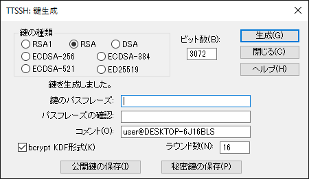 鍵の生成が終わると「 鍵のパスフレーズ 」と「 パスフレーズの確認 」が入力できるようになるため、任意のパスフレーズを決めて入力します。