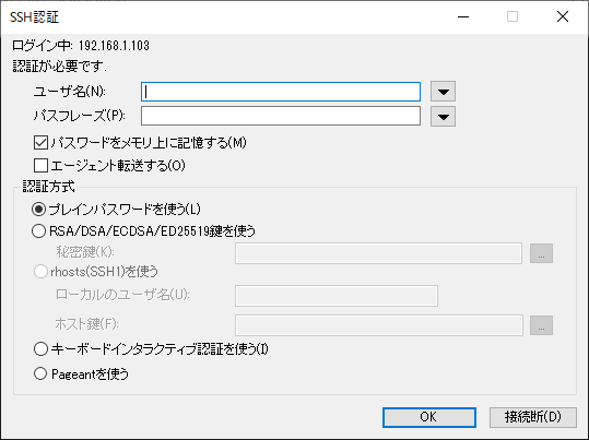 パスワードでの接続の場合、「 認証方式 」を「 プレインパスワードを使う(L) 」を選択します。