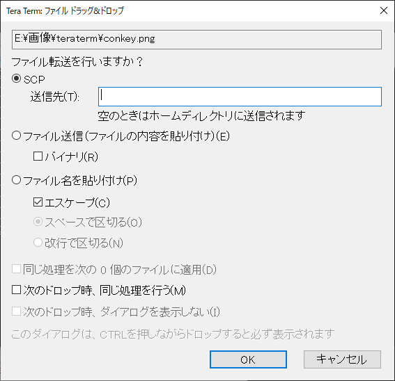 ファイルの転送画面が表示されるため、「 SCP 」にチェックが入っているか確認して OK をクリックします。