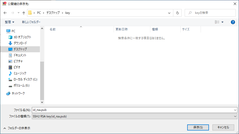 「 公開鍵の保存(I) 」をクリックします。ファイル名はデフォルトで「 id_rsa.pub 」と入力されているため、そのまま保存します。
