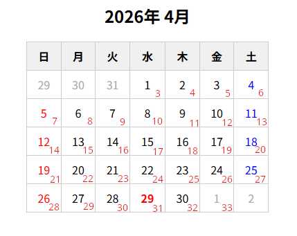 ※以下の画像の日付下の赤文字が曜日の量になります。