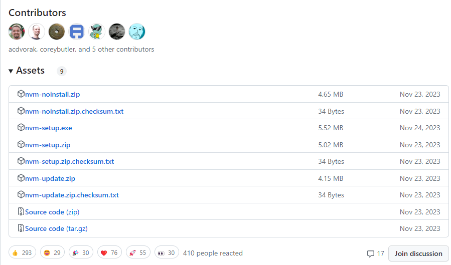 ダウンロードサイトの次のような画面から「 nvm-setup.exe 」というファイルをダウンロードします。