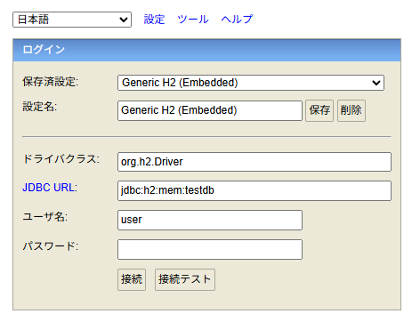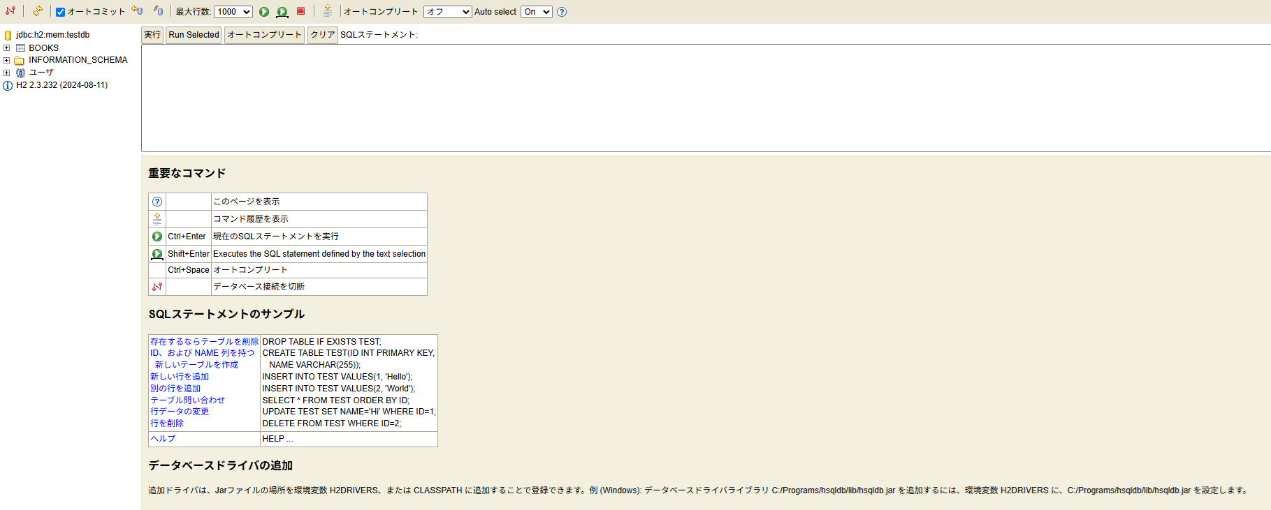INSERT INTO books (title, author) VALUES ('book C', '次郎'); H2 コンソールの起動