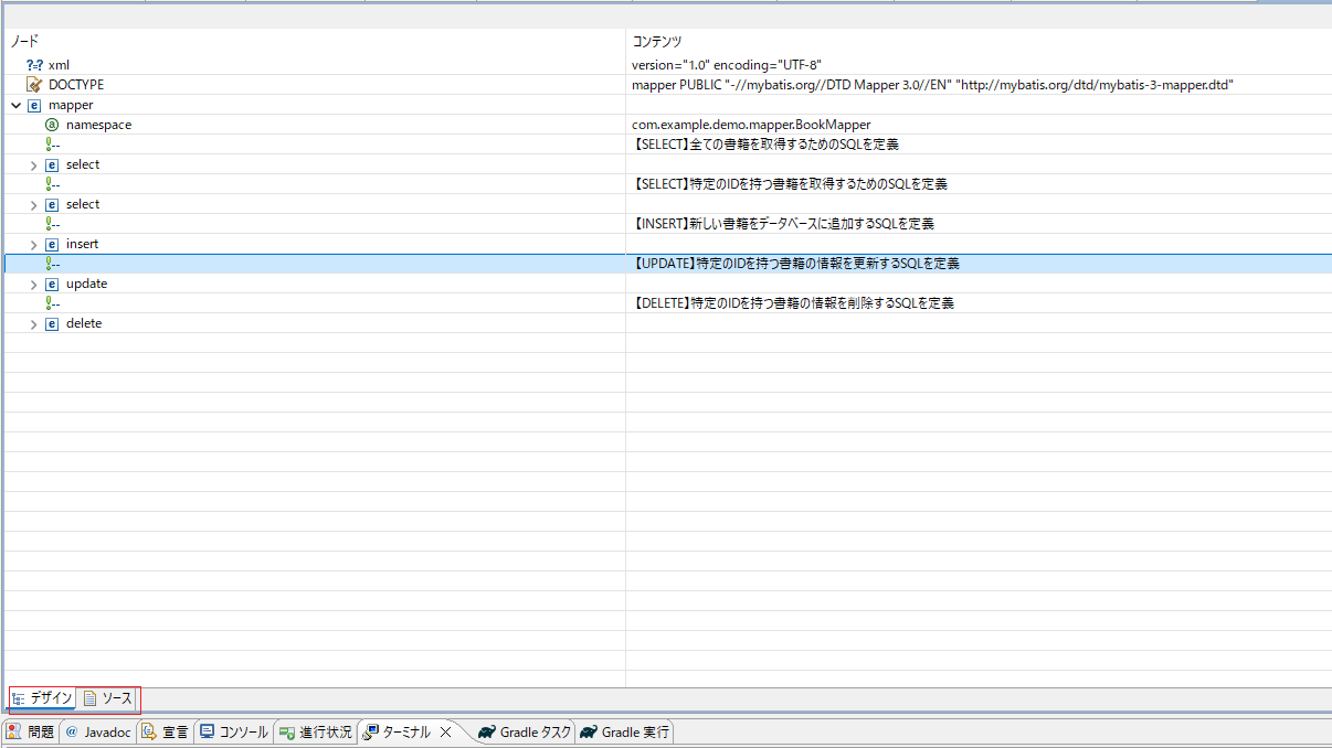 xmlファイルを開き、以下のような表示だとデザインモードです。デザインモードとソースモードを赤色で囲っているタブで切り替えることができます。