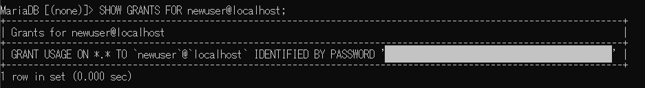 /* mydb:データベース名、users:テーブル名 */ GRANT INSERT, UPDATE, SELECT, DELETE ON mydb.users TO newuser@localhost IDENTIFIED BY 'password';